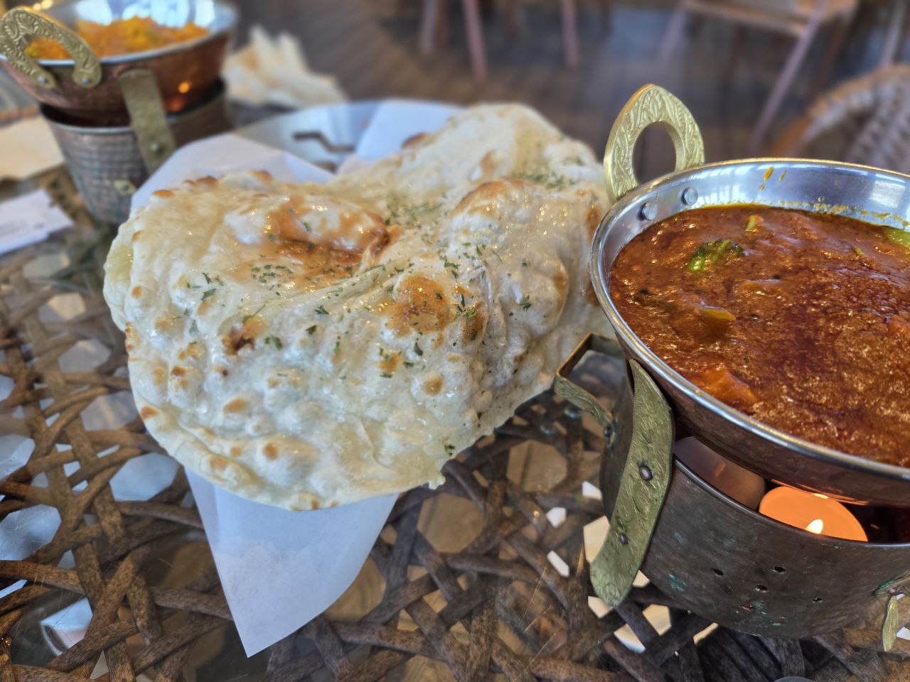 난을 뜯어 찍어 먹는 순간, 매콤한 풍미가 입안을 가득 채운다.