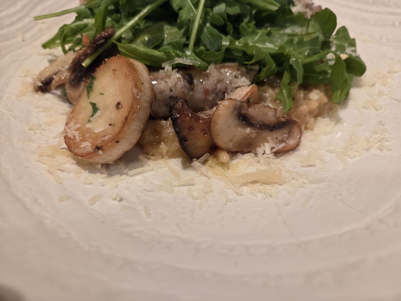 버섯은 촉촉하게 볶아져 풍미가 깊었고, 허브 소시지는 향신료 향이 은근히 살아 있다.