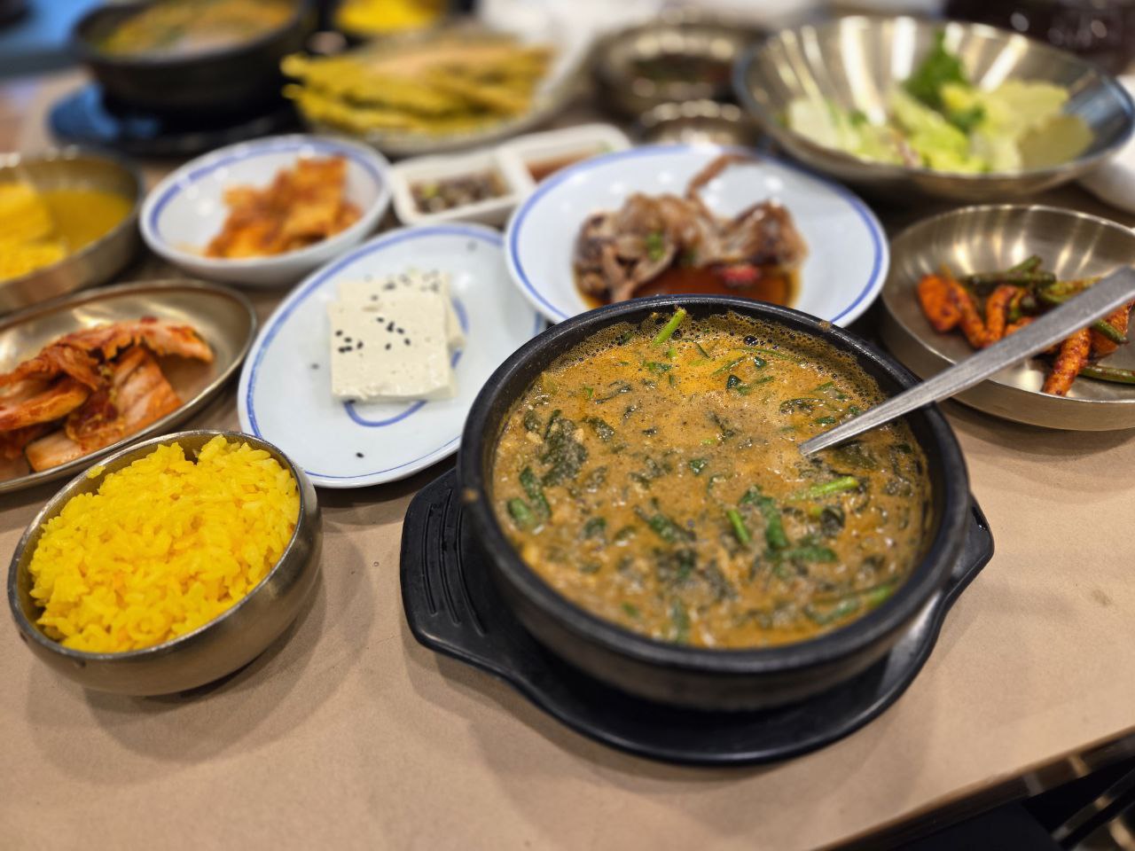 상황추어탕에 제주황게장과 미꾸라지튀김, 솔잎두부까지 한 상으로 나오는 꽉 찬 구성.