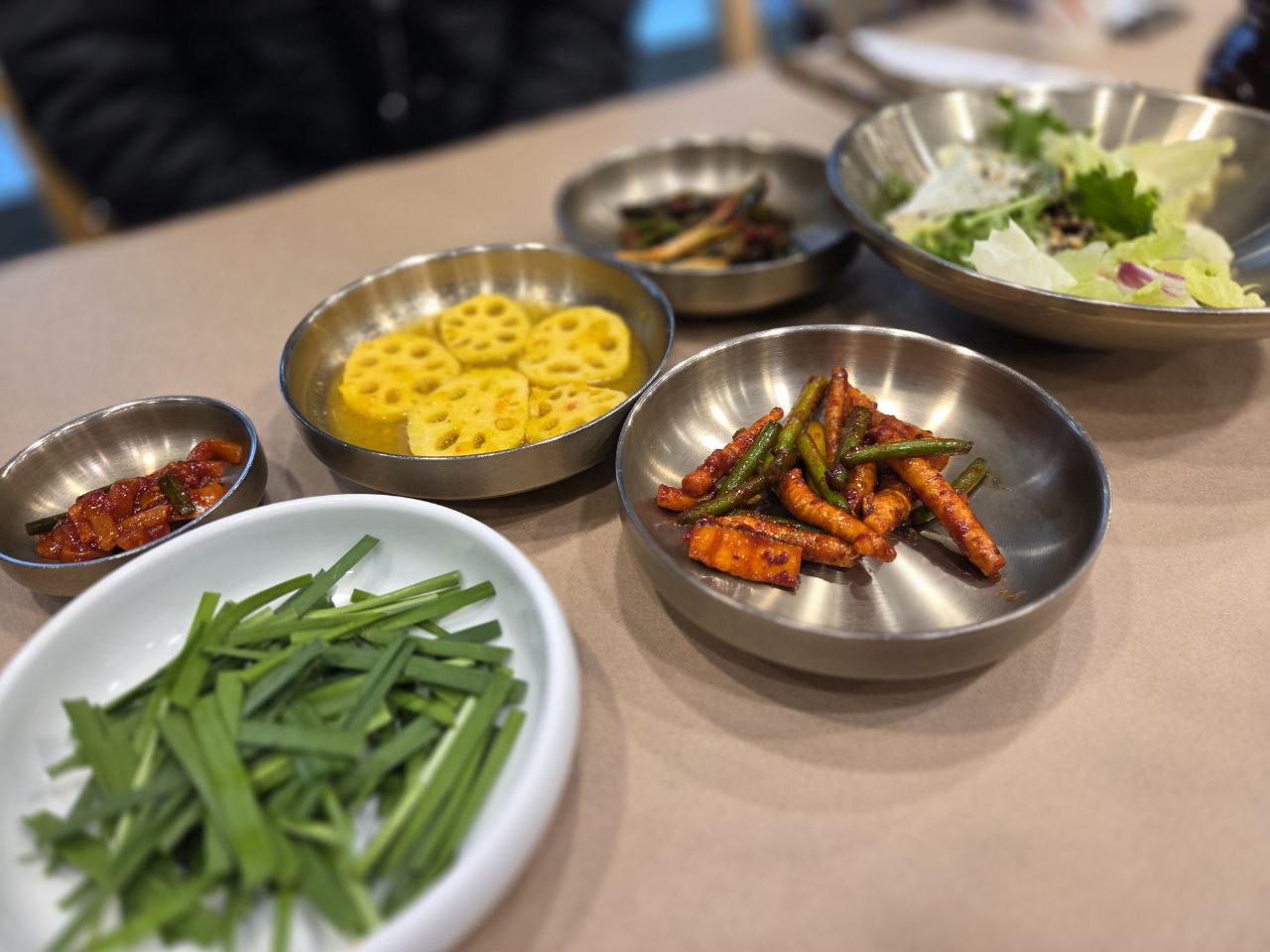 연근조림, 양상추샐러드, 마늘종 더덕무침 등으로 구성된 기본찬.
