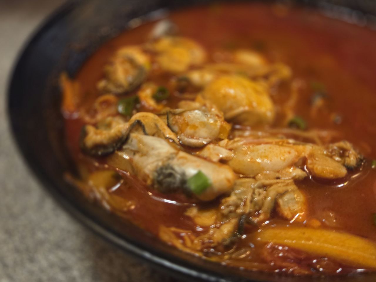 빨간 국물 위로 통통한 굴이 가득, 그 외 고명들도 한가득.
