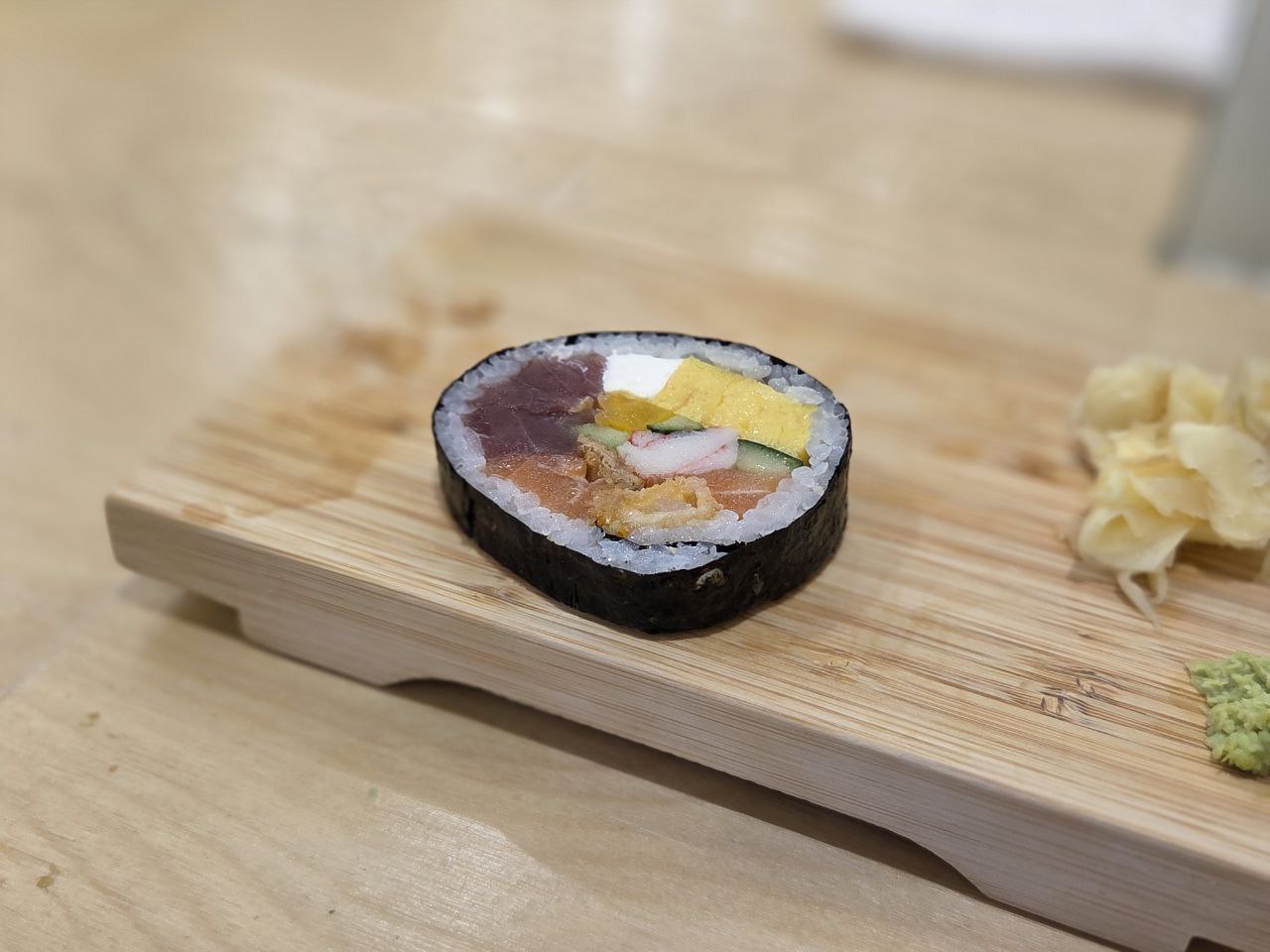 후토마키는 여러 재료가 잘 말려 있어 한입에 코스를 정리해 주는 포인트.